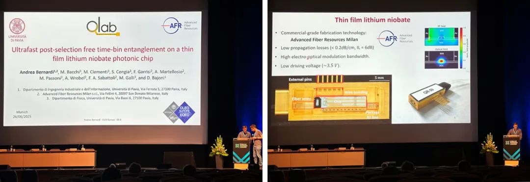 在本次展会同期的会议报告环节中,来自米兰光库团队的Andrea Bernardi作了题为《基于铌酸锂薄膜光子芯片的超快无后选时间片纠缠》的报告,展示了光库科技与合作院校在基于薄膜铌酸锂技术的集成量子光子器件方面取得的最新进展。
