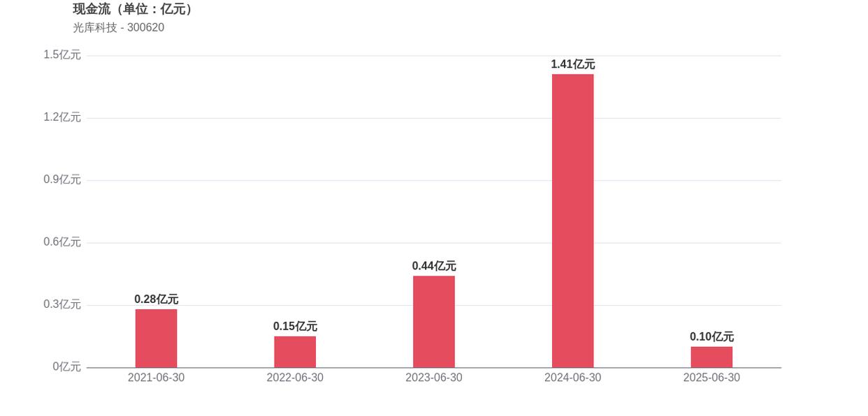 在经营稳健性方面,光库科技面临现金流承压的挑战,存货周转天数为126.01天,较2024年上半年下降了39.46%,表明运营效率有所改善。经营活动产生的现金流净额为0.1亿元,相比2024年同期的1.41亿元,同比下滑了1.3%。此外,2025年上半年的资产负债率为38.64%,同比增长了12.37个百分点,这意味着公司债务负担有所加重。