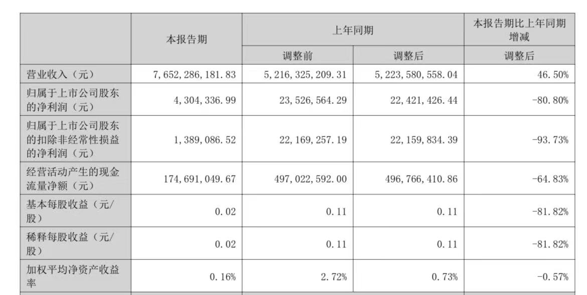 根据公告,公司实现营业收入76.52亿元,同比增长46.5%;归属于上市公司股东的净利润430.43万元,同比减少80.8%。