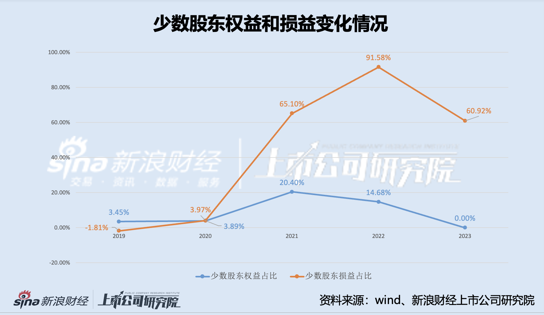 根据资产负债表,2019-2023年少数股东权益占所有者权益合计的比例分别为3.45%、3.89%、20.40%、14.68%和0;而通过利润表发现,近5年少数股东损益在净利润中的占比分别为-1.81%、3.97%、65.10%、91.58%和60.92%。