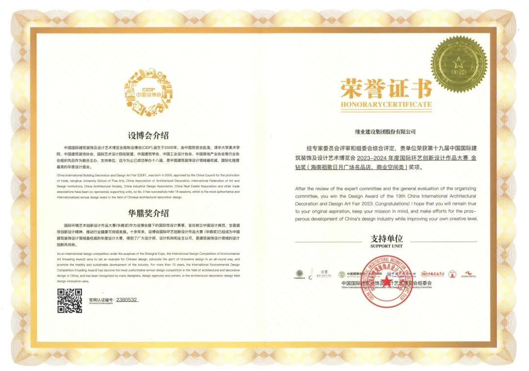 日前,第十九届中国国际建筑装饰及设计艺术博览会“华鼎奖”获奖项目名单正式公布。维业股份设计作品“海南祖歌日月广场名品店项目”、“三亚综合楼项目装饰工程设计”荣获“2023-2024年度国际环艺创新设计作品大赛金钻奖”,再度彰显公司优秀的设计能力和创新的设计理念。