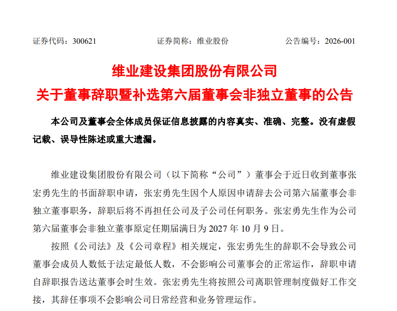 公告显示,张宏勇因个人原因申请辞去公司第六届董事会非独立董事职务,辞职后将不再担任公司及子公司任何职务。