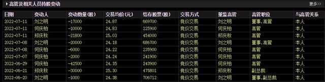 比如,在2022年6月20日至2022年7月11日期间,刘之明合计减持38000股,减持均价超过24元,套现金额超91万元。在2022年6月21日至2022年7月11日期间,郑庆秋合计减持51800股,减持均价超过25元,套现金额超129万元。在2022年6月29日至2022年7月11日期间,何庆柏合计减持60500股,减持均价超过24元,套现金额超145万元。