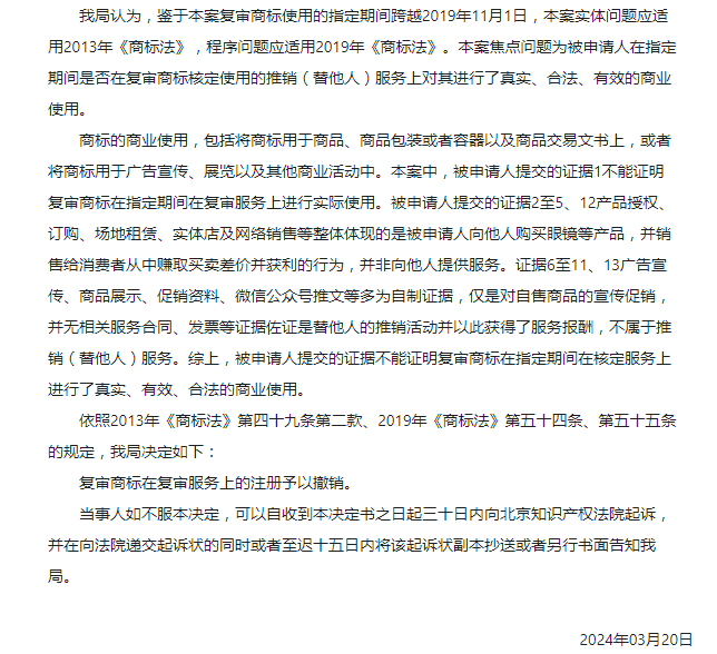 2024年4月4日的复审程序中,国家知识产权局在复审程序中决定撤销该商标在复审服务上的注册。