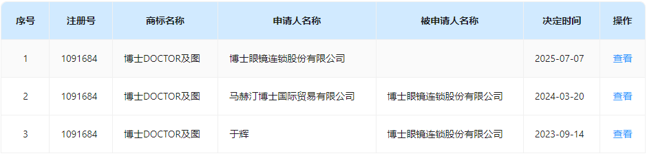据悉,此次诉讼源于第1091684号“博士DOCTOR及图”商标的撤销纠纷。该商标由博士眼镜于1996年5月21日申请注册,专用权期限至2027年8月27日,核定使用服务为第35类"推销(替他人)"。