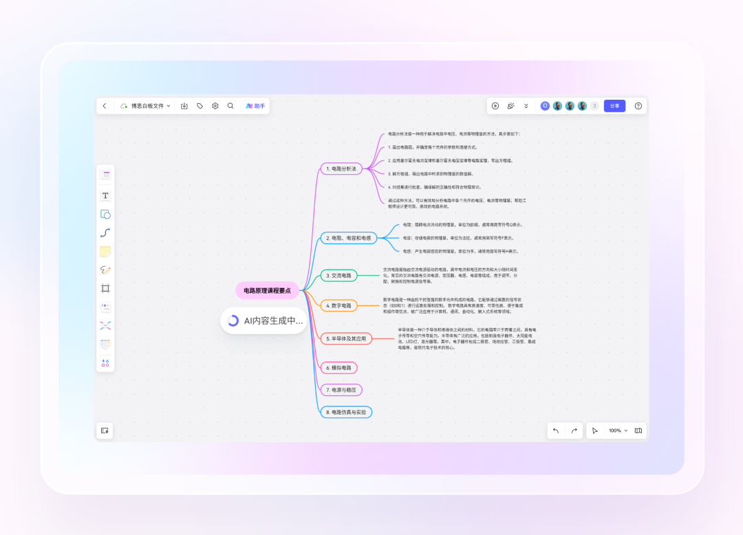 boardmix AI助手提供思维导图、流程图等多种图表类型一键AI生成。围绕给出的主题或关键词,它能够从多渠道搜索资料和信息,进行思维发散拓展,并以不同形式进行内容展现,省去用户大部分基础思考和简单操作,拓展思维边界、激发创新灵感。此外,AI生成的流程图生成还助力知识梳理、流程规划和智能决策,从而快速理清思绪,专业呈现。