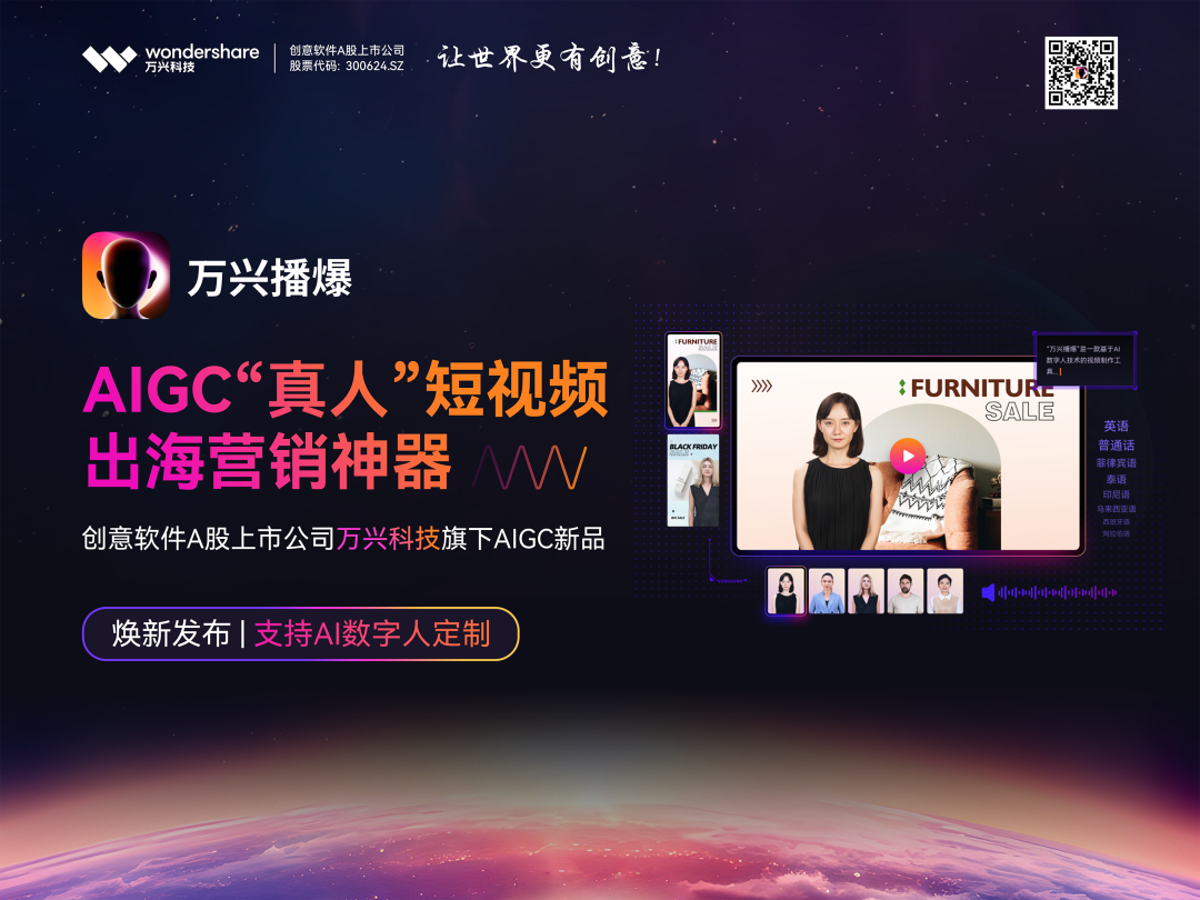 除了博思云创,面向AIGC时代,万兴科技正全力打造高协同的创意软件生态:推出全球首款交互型“图生图”AI绘画软件万兴爱画、首款跨境全场景“真人”数字人AI视频软件万兴播爆;同时,旗下Wondershare Filmora、万兴喵影、Wondershare PDFelement、亿图脑图、墨刀及其海外版Mockitt等产品均已集成AIGC功能。