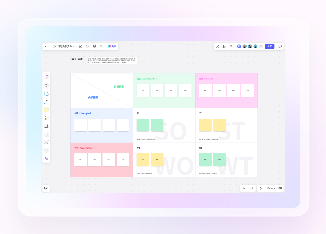 boardmix提供一键智能生成商业模式画布模板、SWOT分析模板、用户画像模板等AI功能;可广泛应用于商业研究、市场分析和用户调查等场景,帮助产品经理迅速了解目标市场和用户。