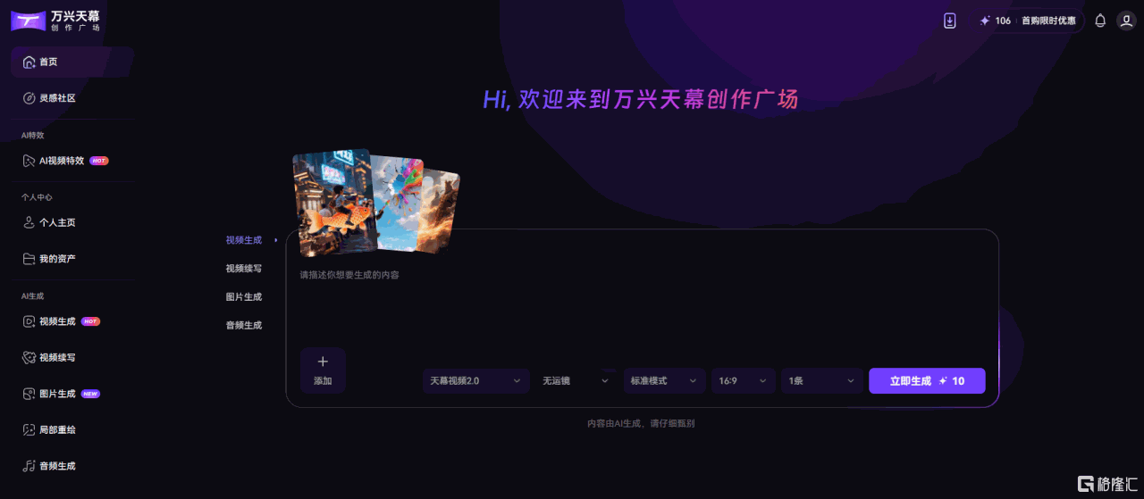 基于万兴天幕2.0,万兴科技持续推出AIGC新品扩充产品矩阵。近期,万兴科技开放AIGC视频创作平台万兴天幕创作广场,以及移动端AIGC视频创作工具万兴天幕AI App,面向创作者提供一站式解决方案,创作者可实现视频生成(文生视频/图生视频/视频续写等)、图片生成(文生图/局部重绘/参考图生图等)、音频生成(文生音乐/文生音效/文生语音/视频配乐等)等多样化的创作需求。