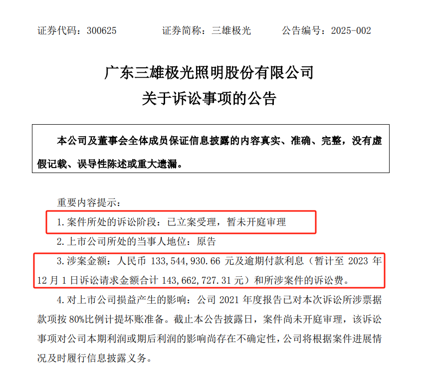 三雄极光表示,2025年1月7日,公司收到深圳市南山区人民法院出具的《受理案件通知书》,法院已于2025年1月7日立案受理。目前,该案件暂未开庭审理。据悉,该诉讼请求金额合计约1.44亿元,包含涉案金额约1.35亿元及逾期付款利息(暂计至2023年12月1日)。此外,所涉案件的诉讼费由两被告人承担。