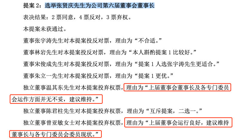 其中张宇涛投出反对票,另有多位董事认为斟酌之下,张宇涛成为董事长更优,也有2位董事认为“上届董事会运行良好,建议维持”。
