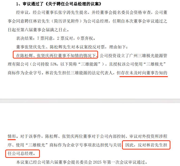 时间回到6月27日。三雄极光第六届董事会第一次会议上,一场罕见的董事长“二选一”对决正在上演。当提名张宇涛为董事长的议案提交表决时,7票赞成,2票反对——张贤庆和陈松辉投下反对票。