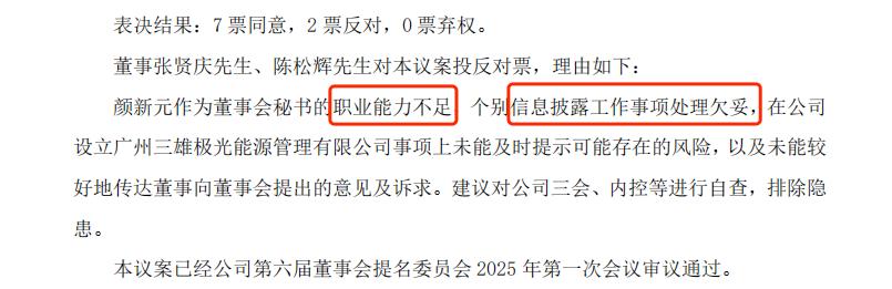 两位董事对公司内部控制、对外投资程序及商标使用表达担忧。对于董事会秘书颜新元的任命,他们以“职业能力不足”和“信息披露处理欠妥”为由投下反对票。