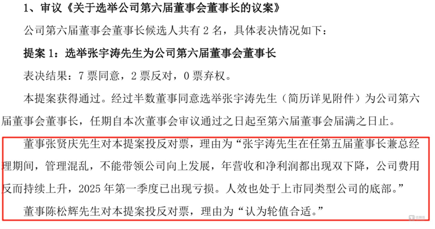 最终,选举张宇涛为董事长的提案以7票同意、2票反对通过,反对票由张贤庆和陈松辉投出。张贤庆认为张宇涛在任第五届董事长兼总经理期间,管理混乱,不能带领公司向上发展,年营收和净利润都出现双下降,公司费用反而持续上升,2025年第一季度已出现亏损;人效也处于上市同类型公司的底部。陈松辉则主张轮值董事长更合适。