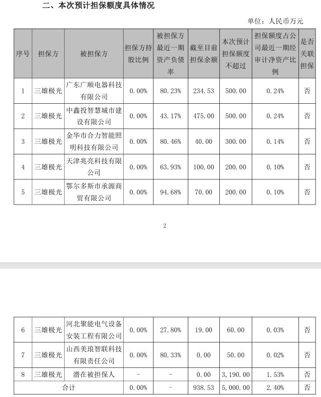 截至公告披露日,上述担保项下仍处于担保期间的余额为938.53万元,占 三雄极光 最近一期经审计净资产的0.46%。