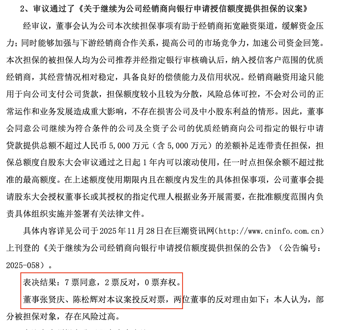 此次分歧并非偶然爆发,而是集中在两大核心争议点。其一为5000万元经销商担保议案,尽管该议案以7 票同意惊险通过,但张贤庆与陈松辉明确指出“部分被担保对象风险过高”。