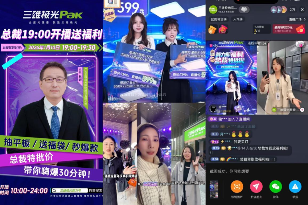 此外,在“舞力即福利,总裁特批价”专场直播中,三雄极光特邀总裁林岩空降直播间,以高层权威为品牌深度背书,强化“全屋光健康,就选三雄极光”的核心承诺,直接降低消费者的决策门槛。直播中,三雄极光还创新采用展厅连麦形式,带领用户沉浸式“云逛店”,直观呈现光效场景,进一步激发用户对理想家居光环境的拥有感与期待。