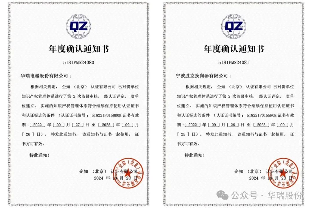 近日,华瑞电器股份有限公司及子公司宁波胜克换向器有限公司顺利完成了知识产权管理体系的监督审核。本次审核由企知(北京)认证有限公司依据相关规定严格执行,经认证评定,公司知识产权管理体系符合继续保持使用认证证书和认证标志的条件。这一成果标志着华瑞股份在知识产权管理领域的持续合规与高效运作,进一步彰显了公司在技术创新与知识资产管理方面的坚定承诺和卓越能力。