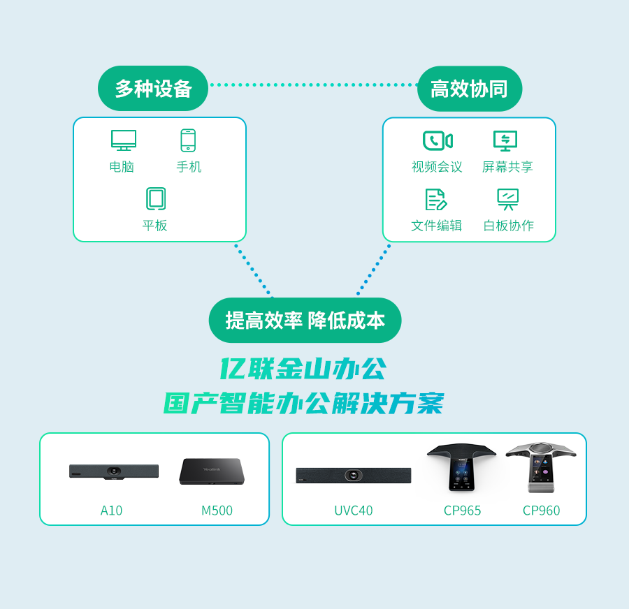 亿联网络和金山办公强强联合,双方优势互补,通过亿联网络智能硬件设备和金山办公高效云会议平台,以及通过云会议和金山办公的“文档中心”打通,无论是小型企业,还是大型企业,还是政府组织单位,无论是在办公室、居家办公还是移动办公,更多组织企业员工们都能享受到高效、便携的办公模式,高效协同,沟通更加简单,更加高效!