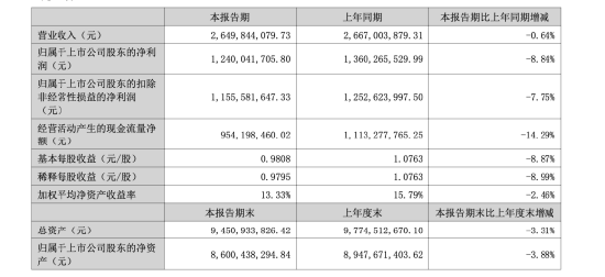 根据公司2025年半年报数据,公司全年实现营业收入26.50亿元,同比减少0.64%;归母净利润12.4亿元,同比增速为-8.84%。