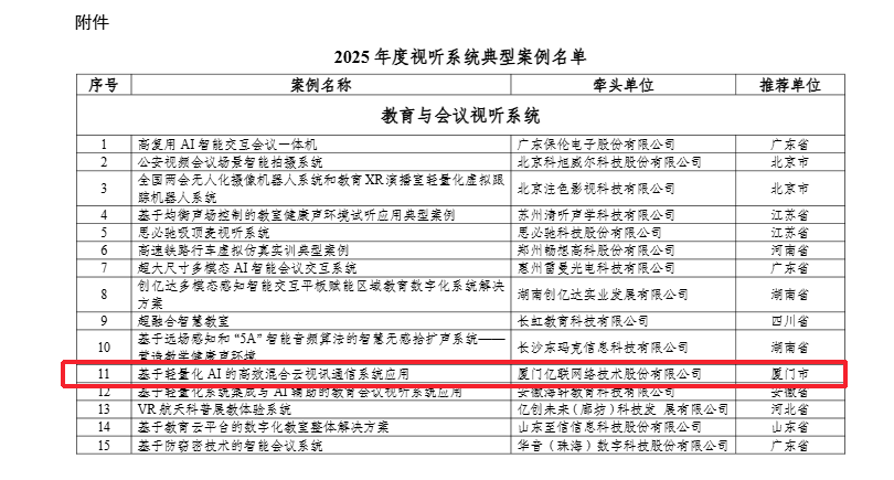 近日,工信部公布“2025年度视听系统典型案例”名单,亿联网络凭借“基于轻量化AI的高效混合云视讯通信系统应用”成功入选,标志着亿联AI视听融合领域的技术实力再获国家级认可!