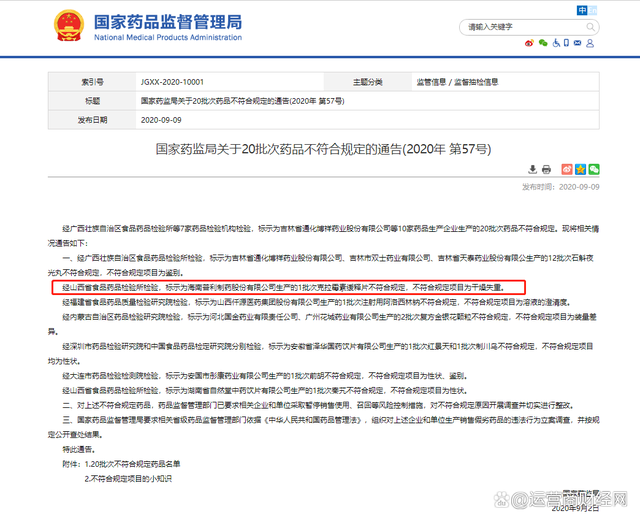 2020年9月,国家药监局发布关于20批次药品不符合规定的通告(2020年第57号),其中,海南普利制药股份有限公司所生产的1批次“克拉霉素缓释片”涉入其中。