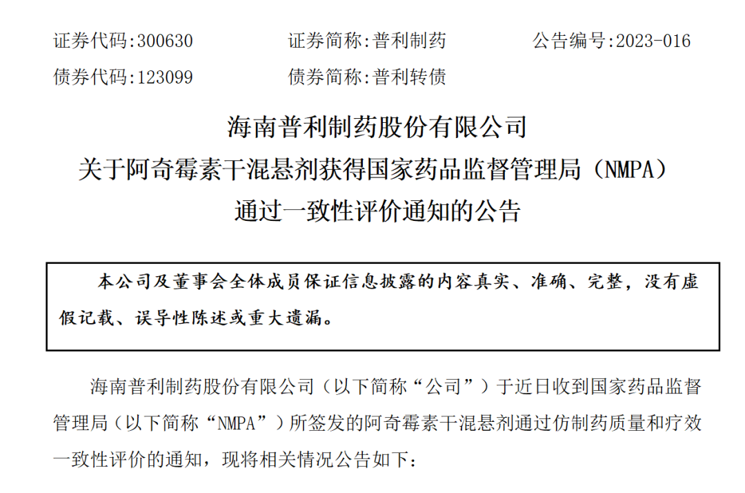 近期,普利制药生产的普利舒奇?阿奇霉素干混悬剂,共计3个规格,通过国家药监局审批,仿制药质量和疗效一致性评价批准上市。