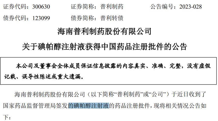 普利制药3月26日公告称,其于近日收到了国家药品监督管理局(NMPA)签发的「碘帕醇注射液」(规格:10ml:2g(I)、20ml:4g(I))药品注册批件(国药准字H20233338、国药准字H20233339)。