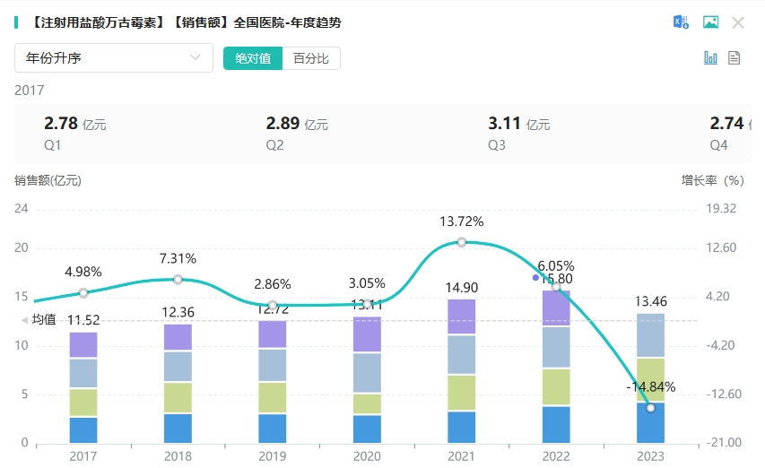 作为抗生素王牌,万古霉素被誉为“人类最后一道防线”,近年来在中国的市场处于稳定增长中,据药融云数据库,2022年注射用盐酸万古霉素在全国院内市场销售额近16亿元,同比增长达6.05%,2023年(截止Q3)该品种在全国院内销售额近15亿元,其中原研市场占有率近80%。