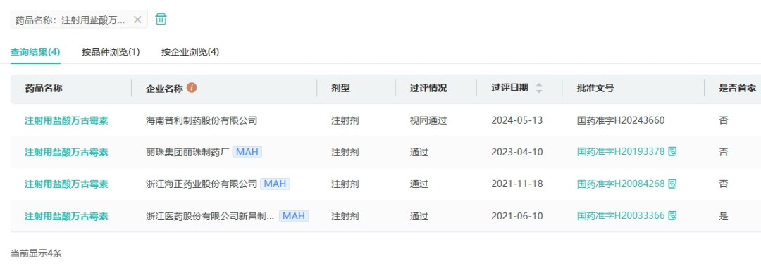 据药融云数据统计,浙江医药为国内注射用盐酸万古霉素首家过评企业,海正药业于2021年11月获批,成为国内该品种过评的第2家企业,丽珠集团2023年4月获批,为国产第3家,此次海南普利制药是国内第4家获批并过评的药企。