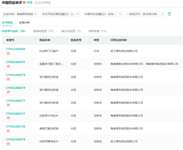 目前海南普利制药提交了钆特酸葡胺注射液、左亚叶酸钙注射液、钆特醇注射液、亚叶酸钙注射液提交了27个品种的仿制申请,2024年至今提交了15个品种的仿制申请,均在审评审批中。