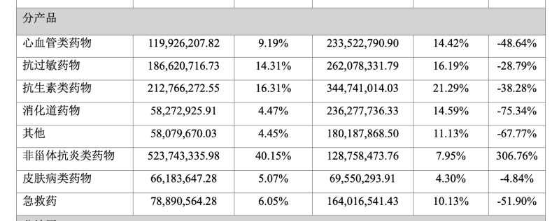 从公司2023年的收入构成来看,报告期内,除了非甾体抗炎类药物一类产品所贡献的收入出现了306.76%的大幅上涨外,其他品类的产品均出现收入下滑,其中多类产品收入下滑幅度超50%。