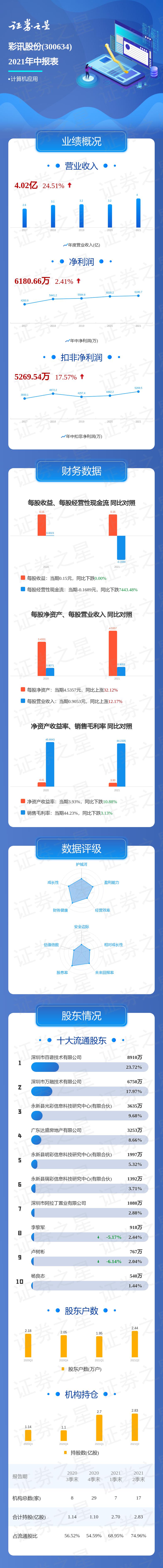 彩讯股份2021中报显示,公司主营收入4.02亿元,同比上升24.51%;归母净利润6180.66万元,同比上升2.41%;扣非净利润5269.54万元,同比上升17.57%;负债率12.51%,投资收益272.69万元,财务费用-77.43万元,毛利率44.23%。