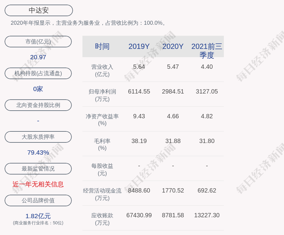 2020年年报显示,中达安的主营业务为服务业,占营收比例为:100.0%。