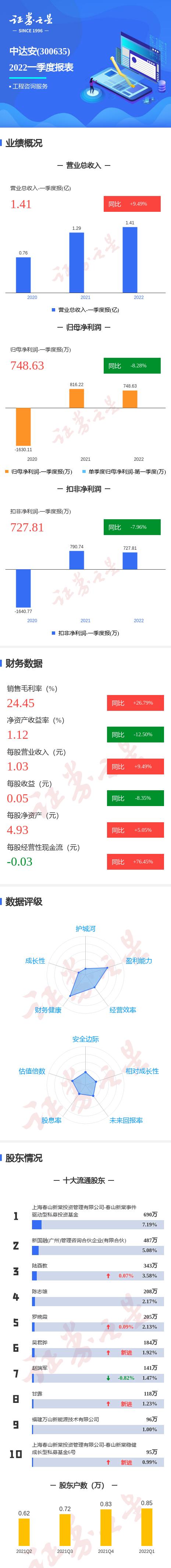 中达安2022一季报显示,公司主营收入1.42亿元,同比上升9.49%;归母净利润748.64万元,同比下降8.28%;扣非净利润727.81万元,同比下降7.96%;其中2022年第一季度,公司单季度主营收入1.42亿元,同比上升9.49%;单季度归母净利润748.64万元,同比下降8.28%;单季度扣非净利润727.81万元,同比下降7.96%;负债率39.82%,投资收益4.7万元,财务费用292.69万元,毛利率24.45%。