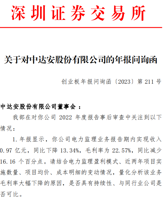 中达安2022年年报显示,期内公司实现营业收入5.9亿元,同比下降2.4%;实现净利润-1.8亿元,同比下降637.61%。其中,电力监理业务实现收入0.97亿元,同比下降13.34%,毛利率22.57%,同比减少16.16个百分点。深交所要求中达安量化分析电力监理毛利率大幅下降的原因,是否具有持续性、与同行业公司是否可比。