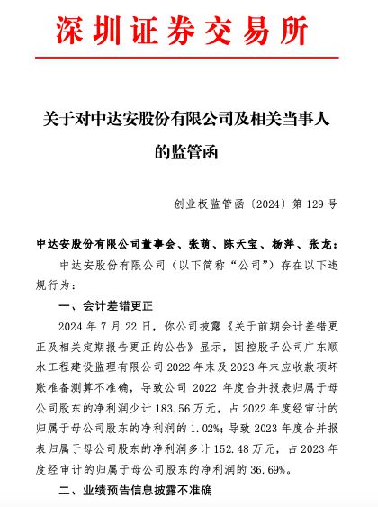 8月16日晚间,深圳证券交易所下发关于对中达安股份有限公司(以下简称“中达安”或“公司”)及相关当事人的监管函。深交所称,中达安存在会计差错更正、业绩预告信息披露不准确、关联交易未及时履行信息披露义务等违规行为。