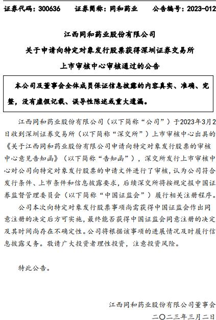 中国经济网北京3月3日讯昨晚,同和药业(300636.SZ)发布公告称,公司于2023年3月2日收到深交所上市审核中心出具的告知函,深交所发行上市审核中心对公司向特定对象发行股票的申请文件进行了审核,认为公司符合发行条件、上市条件和信息披露要求,后续深交所将按规定报中国证监会履行相关注册程序。公司本次向特定对象发行股票事项尚需获得中国证监会作出同意注册的决定后方可实施,最终能否获得中国证监会同意注册的决定及其时间尚存在不确定性。公司将根据该事项的进展情况及时履行信息披露义务。