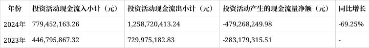 投资活动产生的现金流量净额:投资活动现金流入小计779,452,163.26元,较2023年的446,795,867.32元增长74.45%;现金流出小计1,258,720,413.24元,较2023年的729,975,182.83元增长72.43%;投资活动产生的现金流量净额为-479,268,249.98元,较2023年的-283,179,315.51元,净流出扩大69.25%,主要系报告期内购买理财产品的支出增加。这表明公司在投资方面较为积极,通过合理配置资产,寻求更多的投资收益,但也需关注投资风险。