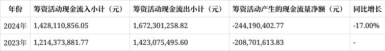 筹资活动产生的现金流量净额:筹资活动现金流入小计1,428,110,856.05元,较2023年的1,214,373,881.77元增长17.60%;现金流出小计1,672,301,258.82元,较2023年的1,423,075,495.60元增长17.51%;筹资活动产生的现金流量净额为-244,190,402.77元,较2023年的-208,701,613.83元,净流出扩大17.00%,主要系报告期内派发现金股利支付的现金增加。公司在筹资活动方面,合理安排资金的流入与流出,以满足公司发展和股东回报的需求。