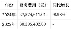 财务费用:财务费用为27,574,611.01元,相比2023年的30,295,402.69元下降8.98%,主要系报告期内利息收入增加。这反映出公司在资金管理方面取得一定成效,通过合理安排资金,增加了利息收入,降低了财务费用。