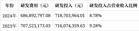 销售费用:2024年销售费用为192,504,236.85元,较2023年的228,946,159.18元下降16.88%。公司可能通过优化销售策略、提高销售效率等方式,有效控制了销售费用。这一变化有助于提升公司的利润水平,但也需关注销售费用下降是否会对市场拓展产生潜在影响。