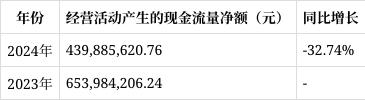 经营活动产生的现金流量净额:2024年经营活动产生的现金流量净额为439,885,620.76元,较2023年的653,984,206.24元下降32.74%,主要系报告期内收到的货款减少。经营活动现金流量净额的大幅下降可能影响公司的资金流动性和日常运营,公司需加强应收账款管理,优化销售回款政策,以提高经营活动现金流入。
