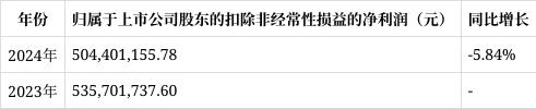 扣非净利润:归属于上市公司股东的扣除非经常性损益的净利润为504,401,155.78元,较2023年的535,701,737.60元下降5.84%。扣非净利润的下滑可能受到市场竞争加剧、研发投入增加等因素影响,反映出公司主营业务盈利能力面临一定挑战。