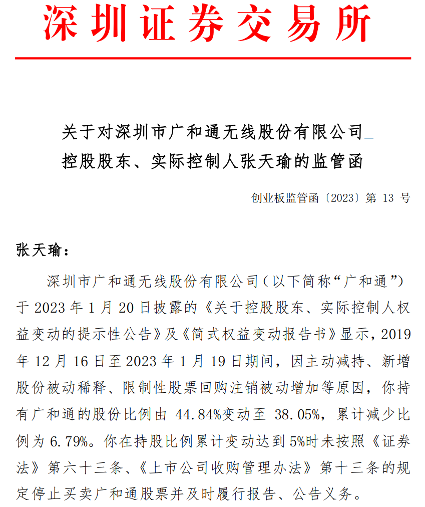 对此,深交所2023年2月6日给张天瑜发出监管函,称其在2019年12月到2023年1月期间,因主动减持、新增股份被动稀释、限制性股票回购注销被动增加等原因,持有广和通的股份累计减少比例为6.79%。在持股比例累计变动达到5%时,未按规定停止买卖广和通股票,且未及时履行报告、公告义务。