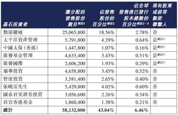 根据最终发售价及配发结果公告,广和通的基石投资者包括:勤道赣通、太平洋资产管理、中国太保(香港)、广发基金管理、广发国际、瑞华投资、智度投资、张晓雷、国泰君安证券投资、君宜香港基金。