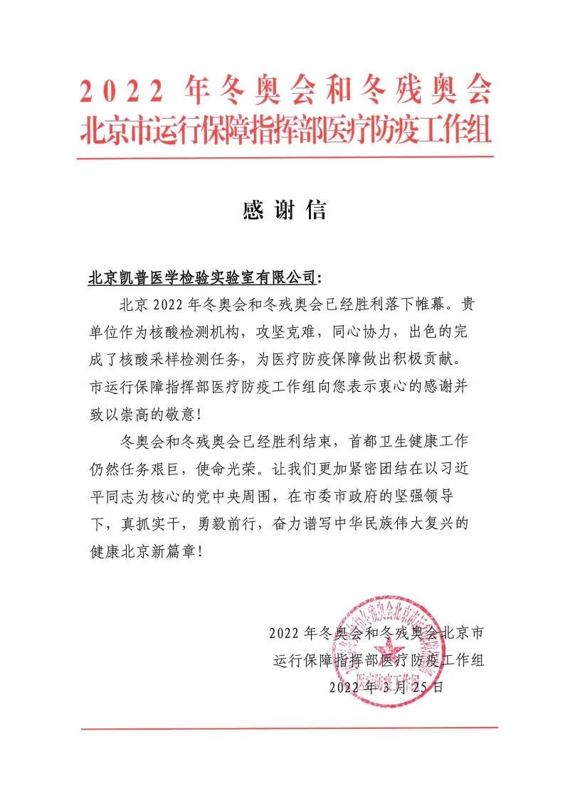 经过相关部门的严格遴选,凯普生物下属北京凯普医学检验实验室获批成为北京冬残奥会核酸检测单位之一,凯普生物核酸保障团队的专业、出色表现,获得了冬奥会和冬残奥会北京市运行保障指挥部医疗防疫工作组的高度认可。