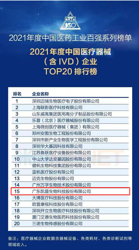 作为生物科技行业的领军力量之一,凯普生物凭借优异的业绩表现、创新的技术实力与强烈的社会责任感脱颖而出,荣登“2021年度中国医疗器械TOP20”排行榜。