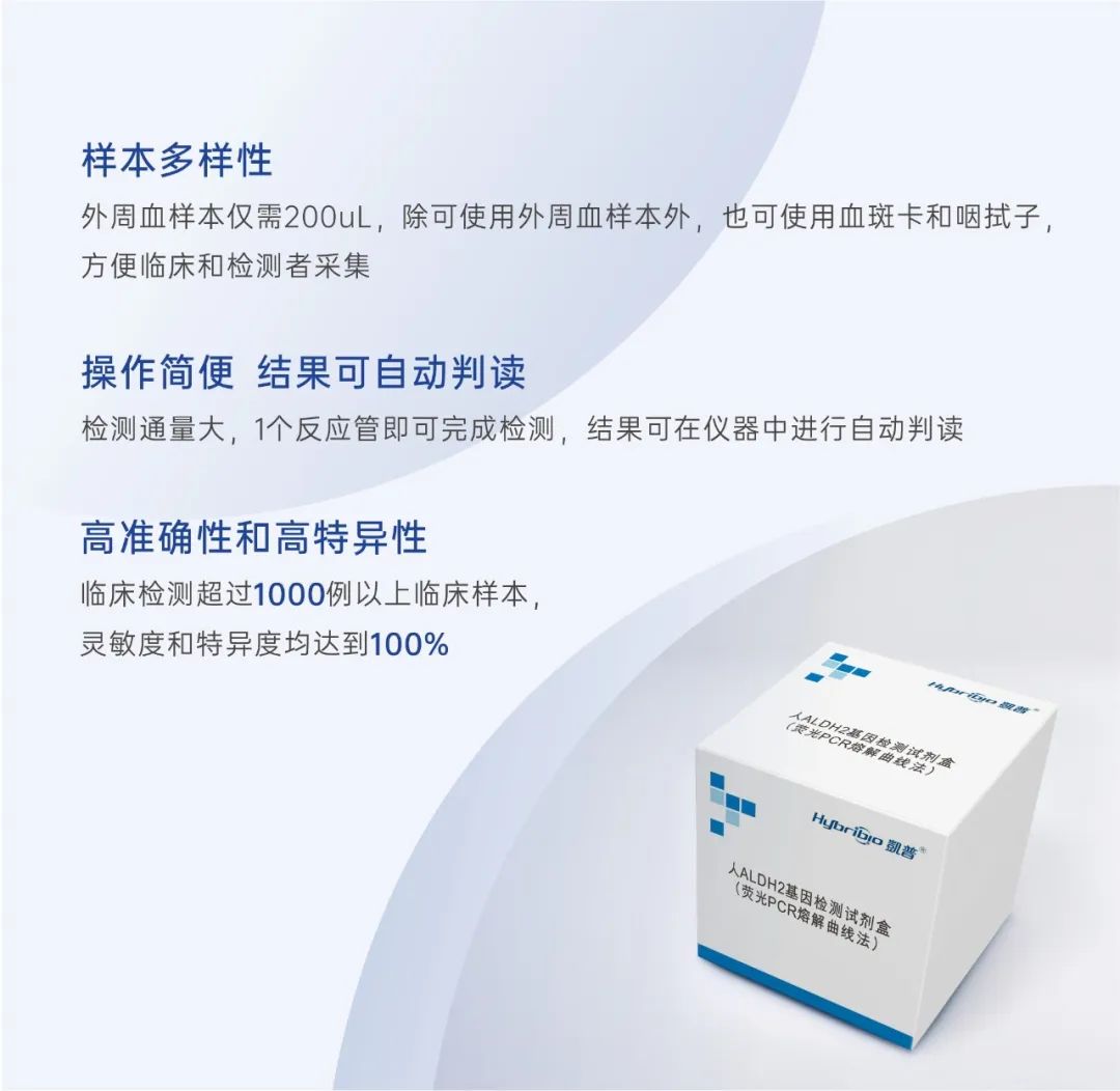 本产品采用荧光PCR熔解曲线法,通过检测人全血样本中ALDH2 基因c.1510 G>A 位点(ALDH2*2)的多态性,用于硝酸甘油的用药指导,辅助医生制定硝酸甘油治疗策略,同时可评估个体酒精代谢能力,指导受检者正确饮酒,避免不当饮酒对身体造成的伤害。