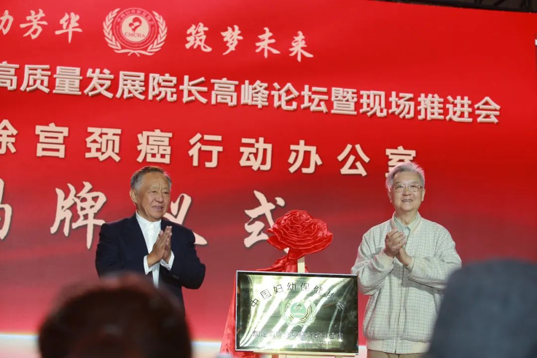 张文康老部长、管乔中董事长共同为“加速消除宫颈癌行动办公室”正式揭牌,并将牌匾授予中国妇幼保健协会孙爱军副秘书长、广东省 HPV 及相关疾病工程研究中心研究员谢龙旭博士。